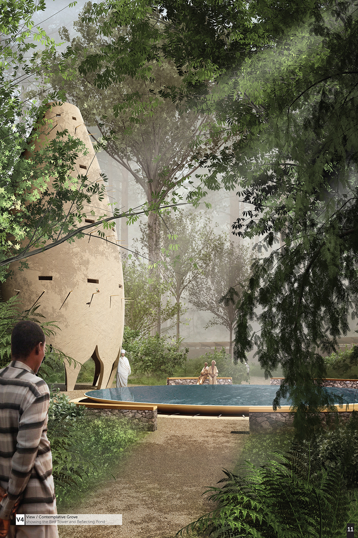 The Chapel embeds Christian references, notably the trinity of openings behind the alter situated below the central oculus. In so doing we acknowledge Ethiopia’s dominant religious group, yet this symbolism is subtle and can be viewed in a nonsectarian light. This move makes the architecture inviting to multiple local communities, while still making physical a sacred space. Furthermore, nature itself, while claimed by many religions is not a passive recipient to the architecture of this project. Instead, nature is front and center as a collaborator. Silva Loop aspires to create a sacred space that accommodates a nondenominational religious practice and an expanded congregation to include non-human actors, including birds and trees.